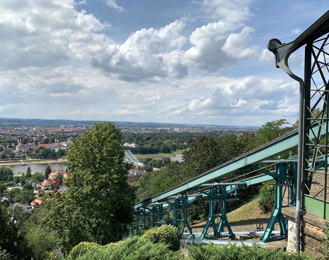 Расстояние в 274 метра преодолевается за 5 минут. За это время по громкой связи нам рассказывали историю подвесной железной дороги и советовали, чем мы можем заняться наверху. На самой высоте находится смотровая площадка высотой 84 метра. С этого места, который ещё называют «балконом Дрездена», можно сделать потрясающие панорамные фото.