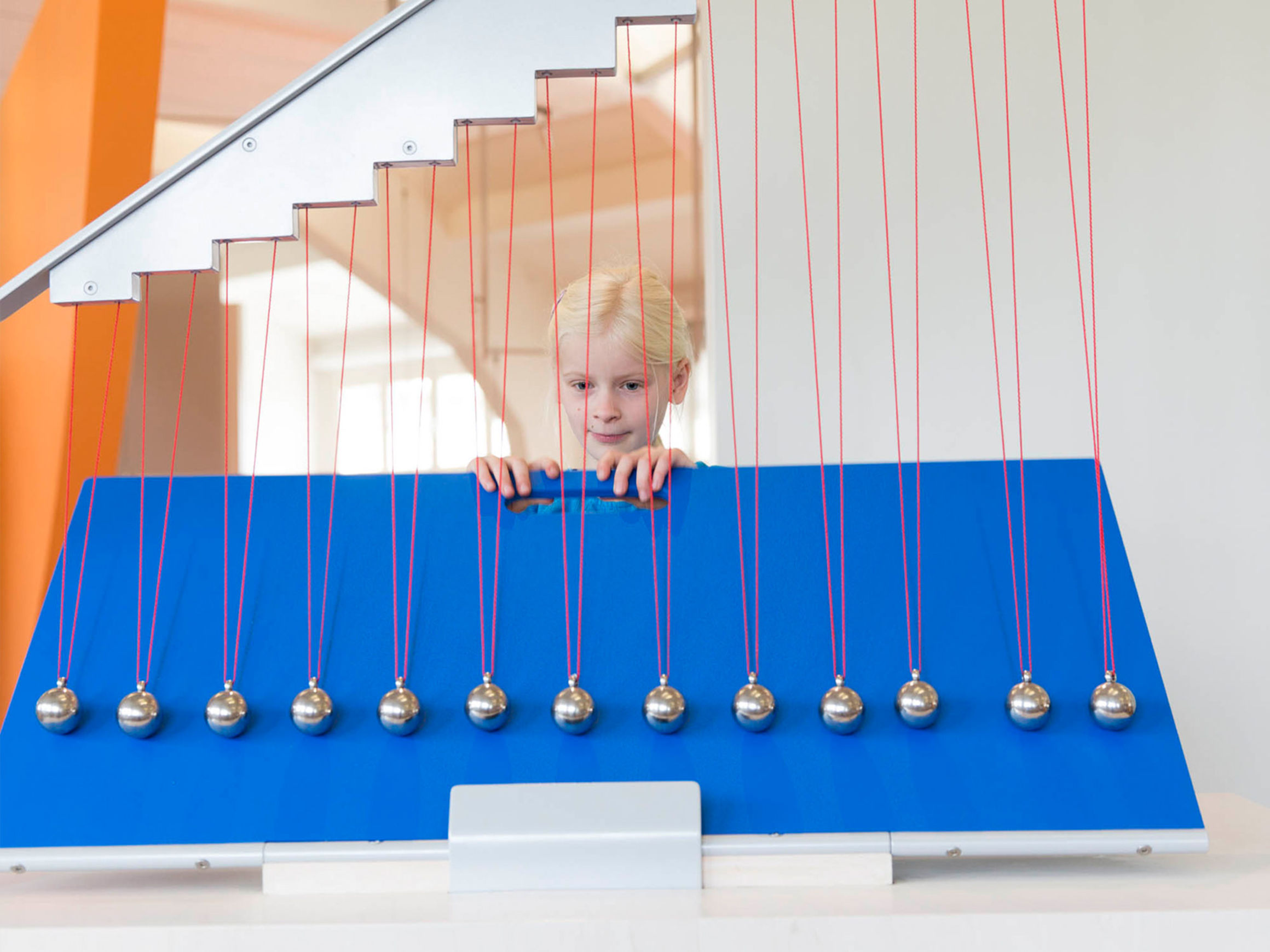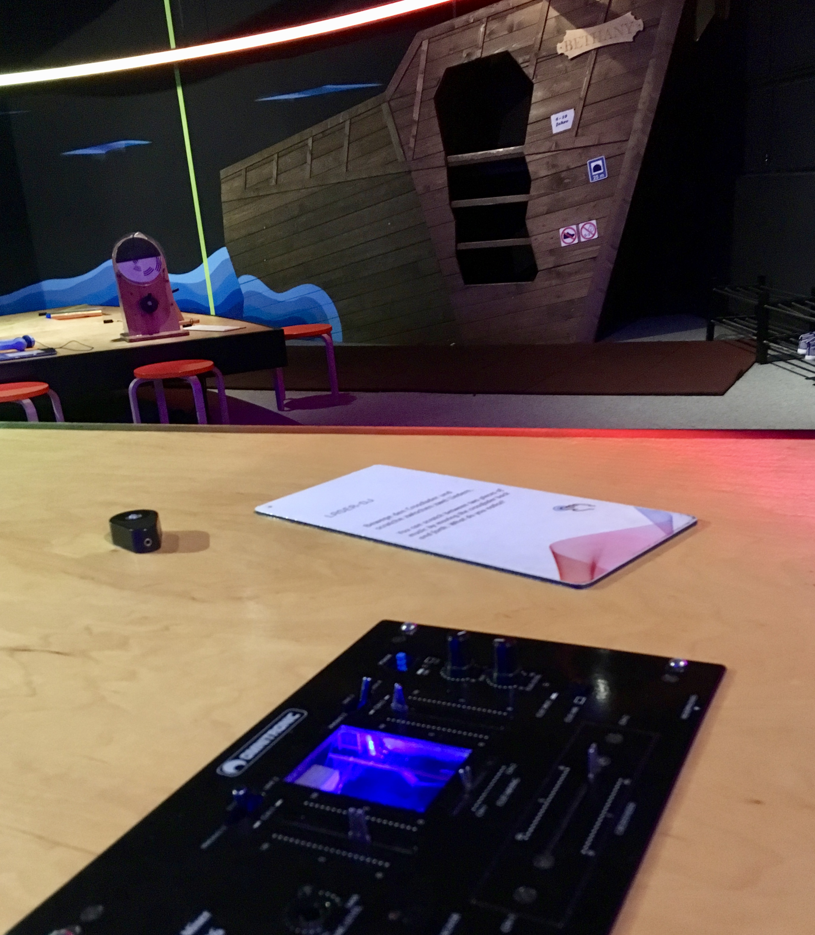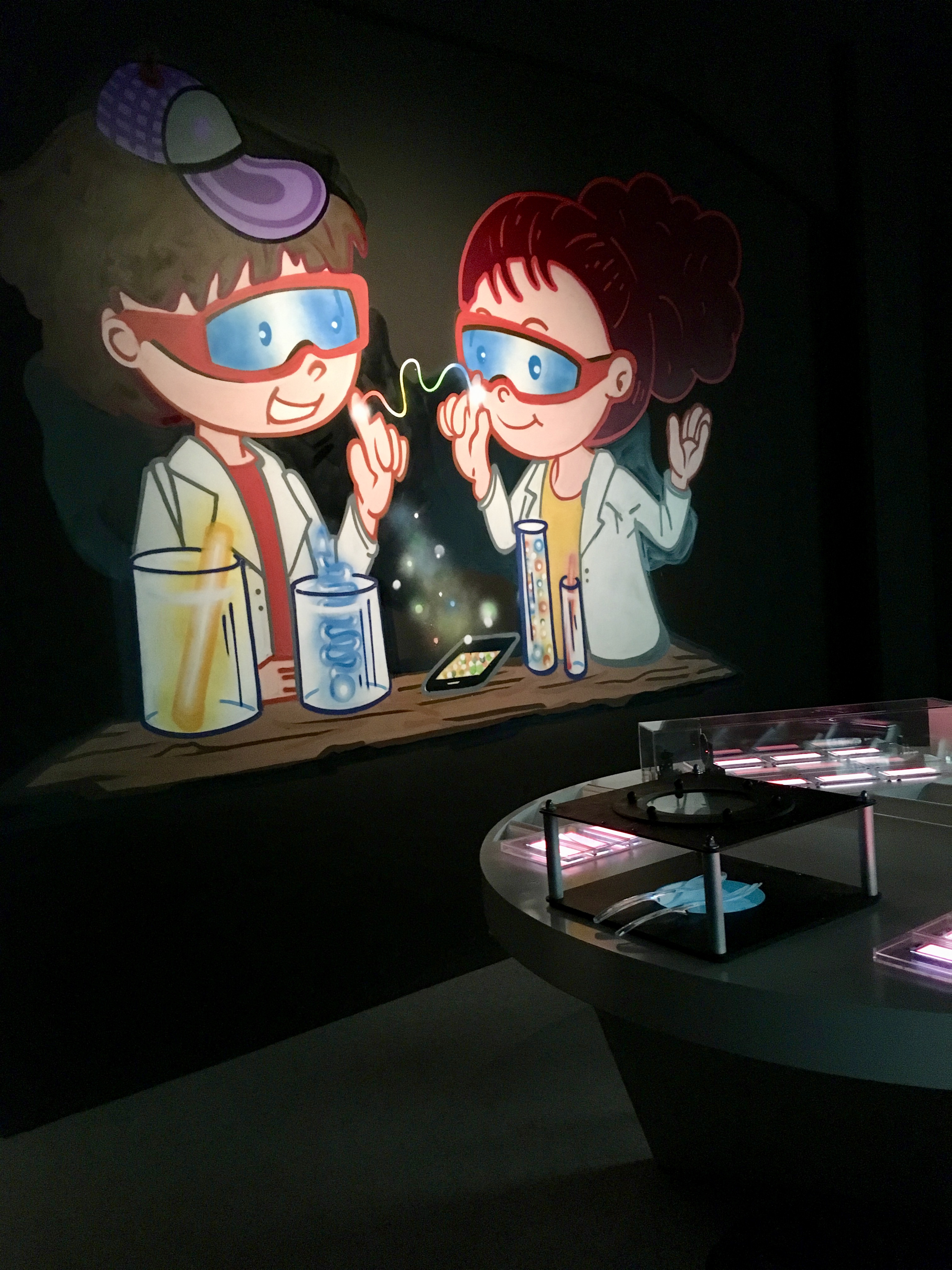 Следующей нашей остановкой стал этаж с выставкой WELLENREITER, посвящённой звуковым и cветовым волнам. Сперва кажется, что попал в какую-то секретную лабораторию — темно, всё шумит и сверкает. 50 интерактивных оптико-акустических экспериментов понравятся не только детям. Мамы и папы, бабушки и дедушки с огромным интересом и энтузиазмом сидели за столами и делали опыты. Можно ли услышать цвет и увидеть звук? Можно ли играть в световой футбол? Моей дочке особенно понравился “затонувший корабль” с горкой, сухим бассейном и неоновой подсветкой.
