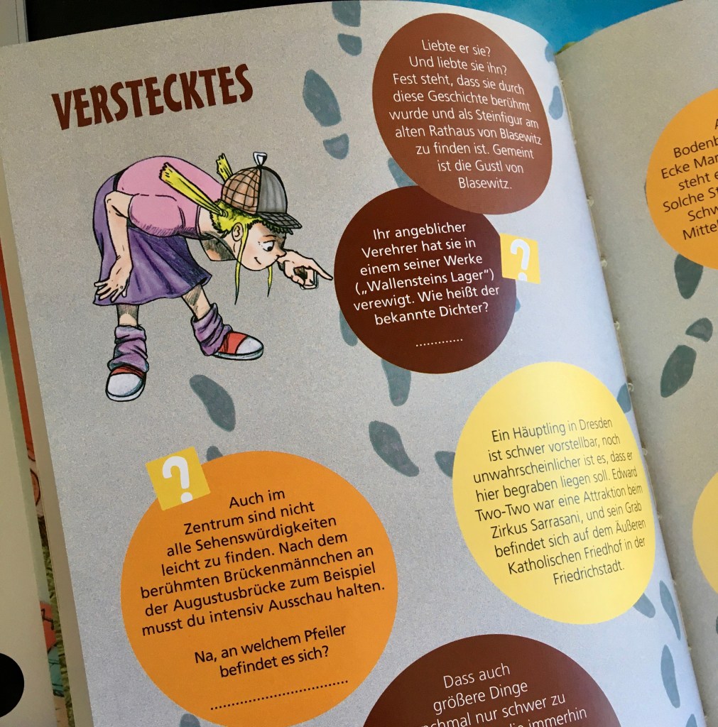 2️⃣ Dresden entdecken. Der Stadtführer für Kinder (для детей 9-11 лет). Путеводитель по Дрездену от детского эксукрсовода. Очень много информации, которая разбита по темам: «Животные», «Водоёмы», «Музеи». Яркие иллюстрации, загадки и ребусы. Книгу также можно приобрести на medimops или, например, на Thalia.de.