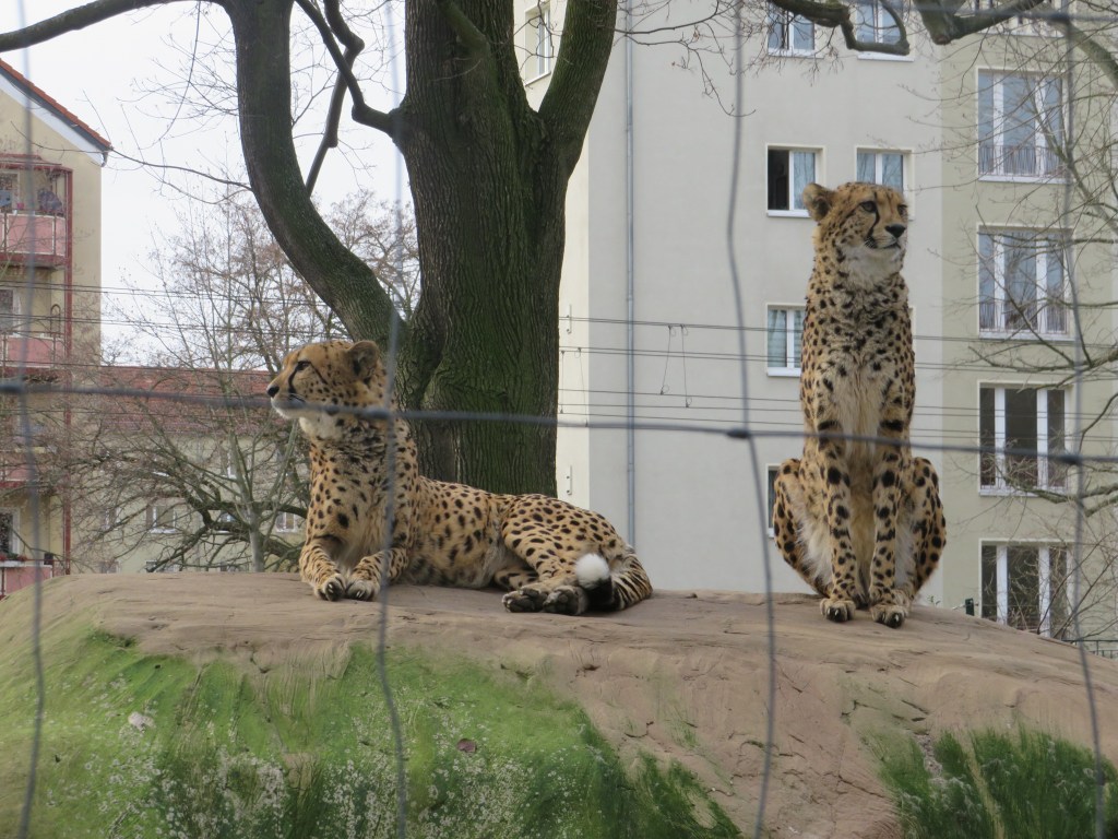 Рядом с ними живут два гепарда, у которых всегда озабоченный вид. Они не расслабляются ни на минуту и кажется постоянно находятся в поиске добычи.