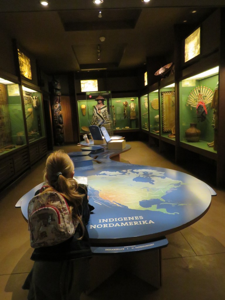 Сначала мы зашли в «Villa Bärenfett». Надо сказать, моя дочка не особый фанат индейцев и, честно признаться, у нас были пробелы в знаниях по этой теме. Но выставка „Indianer Nordamerikas“ легко и непринужденно приглашает окунуться в этот мир и узнать о быте и культуре коренных жителей Америки. Как они охотились? Где они жили? Во что одевались? Как выглядят представители этого народа сейчас? Большое количество уникальных и раритетных экспонатов из 18-20 веков, наглядность и интерактивность.