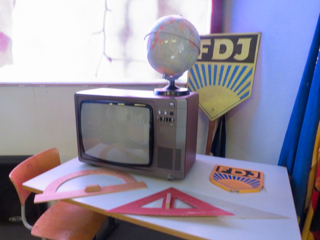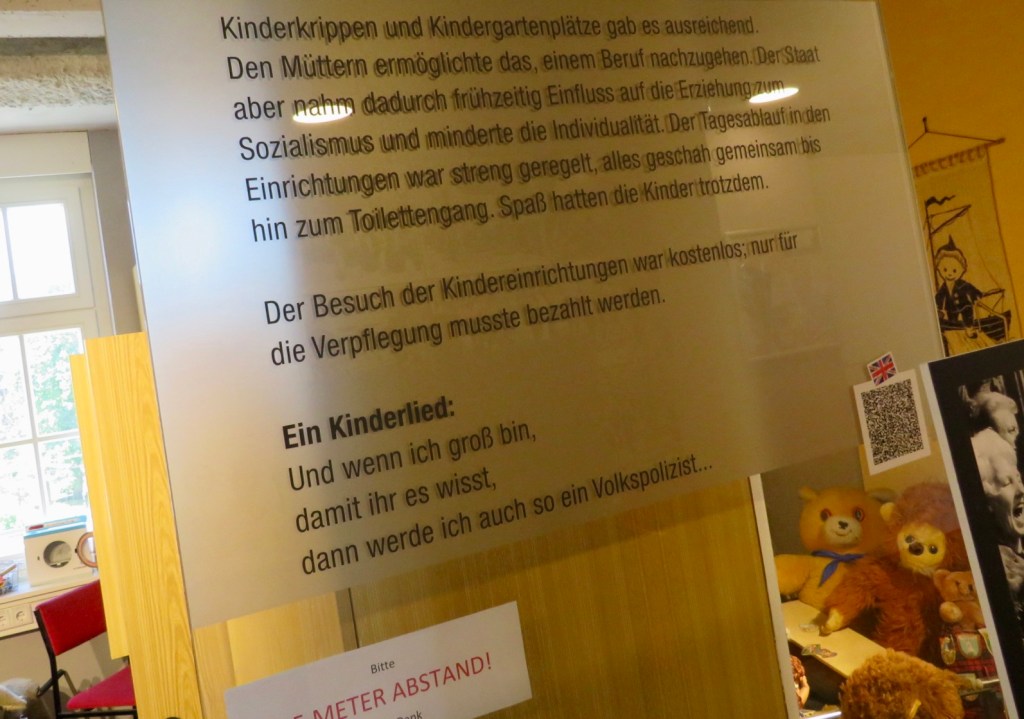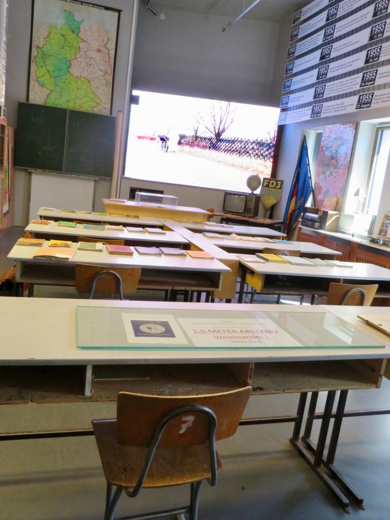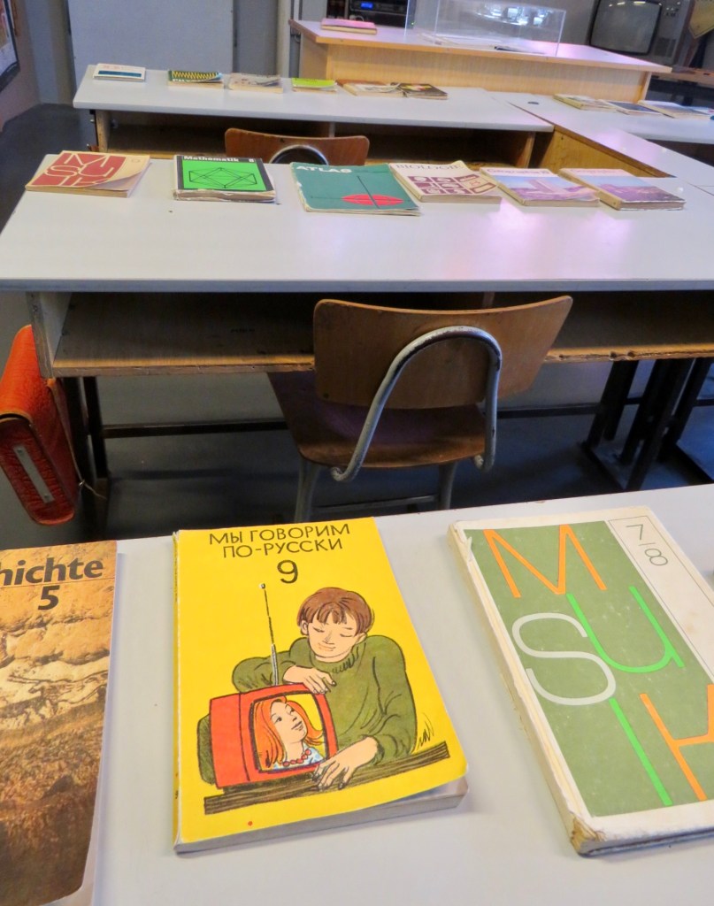 Отдельная комната посвящена школе в ГДР — здесь можно посидеть за настоящими партами того времени, полистать школьные тетради и контурные карты, даже порешать задачки по математике из старых учебников. Не удивляйтесь, когда увидите учебник русского языка на парте. «Русский язык как иностранный» был обязательным школьным предметом, русский язык учили с 5 -го класса. Многие немецкие учителя проходили обучение в университетах Советского союза. Увы, сейчас русский язык вытеснили из школьной программы английский, французский, испанский и другие иностранные языки. Но всё же во многих школах (чаще всего в гимназиях) на востоке Германии до сих пор преподают русский язык.