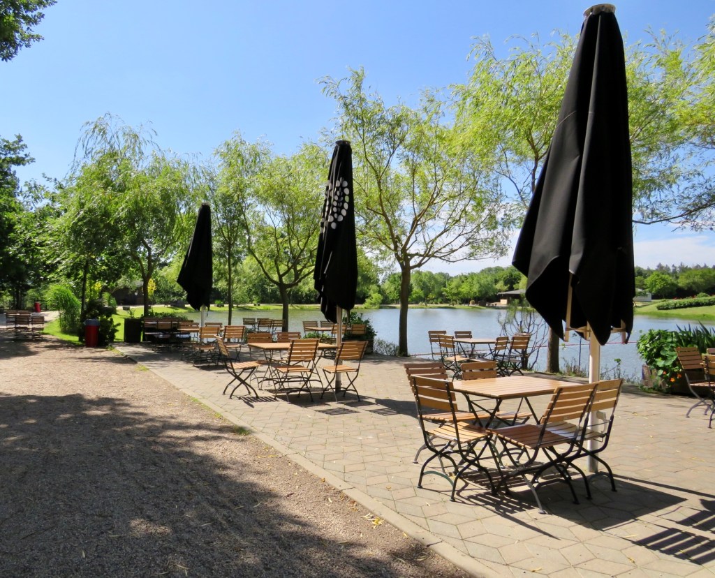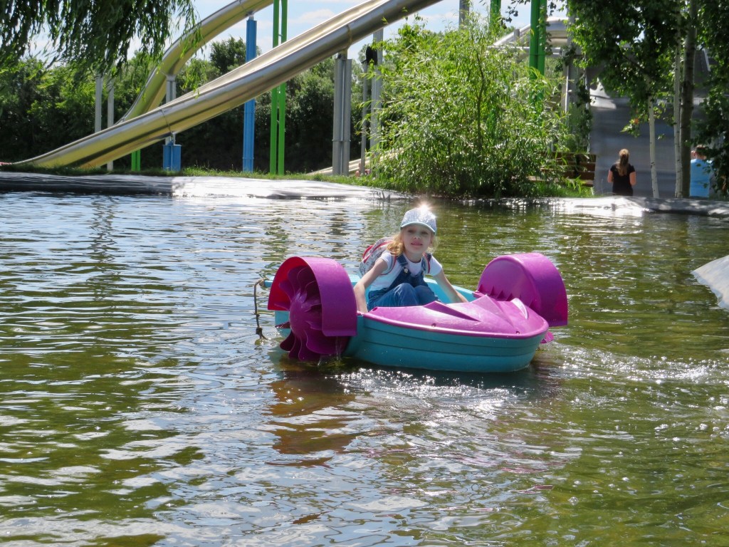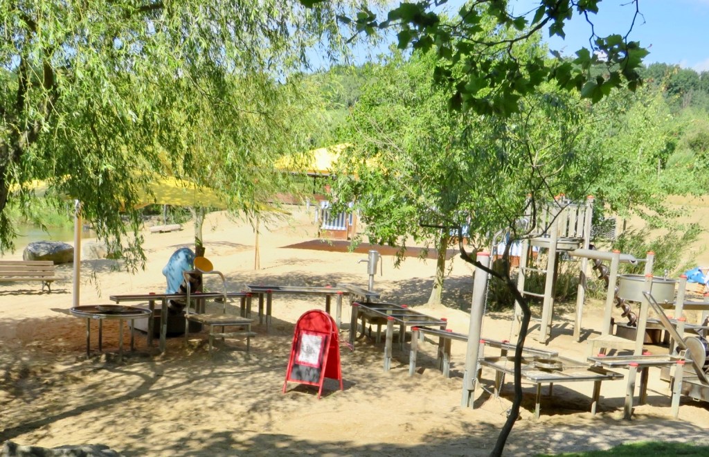 Озеро с песчаным пляжем, «пляжными корзинками» (нем. Strandkorb) и «водной» детской площадкой — Wasser-Matsch-Paradies. Смотрится действительно заманчиво — кусочек Балтийского моря в сердце Саксонии. Жаль, мы не взяли с собой купальники и сменную одежду, иначе присоединились бы к другим отдыхающим, купались, загорали или играли бы в пляжный волейбол. Единственное, что мы попробовали, это покататься на плотах по озеру. На деле это было не так просто, как смотрится со стороны.