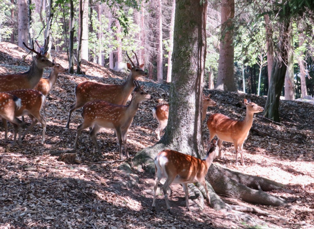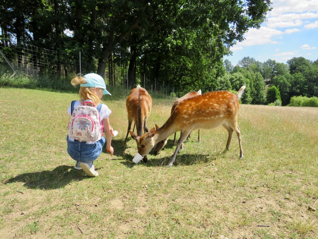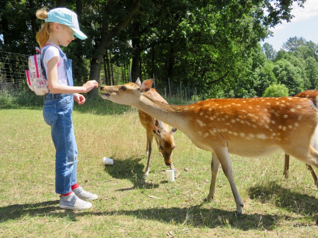 Wildgehege — это целые поляны, по которым свободно гуляют олени, лани, степные козы… Такое чувство, что это не они живут в парке, а посетители пришли к ним в гости в лес — животные на вас совершенно не обращают внимания. Некоторых вы можете погладить и покормить — рядом стоят специальные автоматы с кормом для животных. Есть также загоны с осликами, фазанами, козочками. И всё это рядом с детскими площадками, лужайками, каруселями… Смотрится довольно необычно.