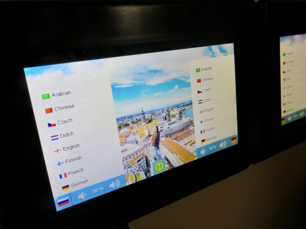 Как это работает? Покупаем билет на автобусный тур у распространителей или на сайте, садимся на одной из остановок в двухэтажный автобус. От водителя получаем наушники. Для чего? В автобусе помимо аудиогида на многих языках (в том числе и на русском), есть детский аудиоканал (подписан как «Kindertour»). Там детям в доступной и игровой форме рассказывается о Дрездене. Маше понравилось.