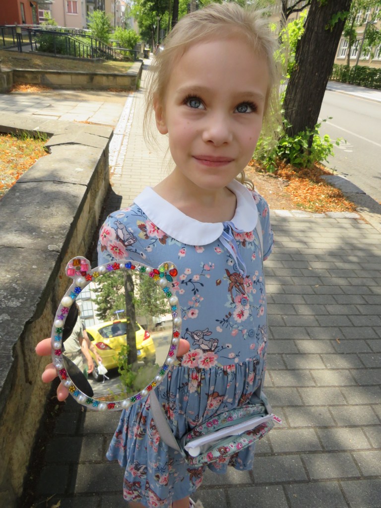 В конце Машу ждала вторая часть экскурсии — креативная. В специальном помещении в подвале Residenzschloss находится комната, в которой не только #ferienkunder, но и школьные группы мастерят что-то своими руками. Поскольку наша тема была «Зеркала», то и Маша под чутким руководством украсила «золотом-бриллиантами» себе зеркальце. Чудесный сувенир на память!