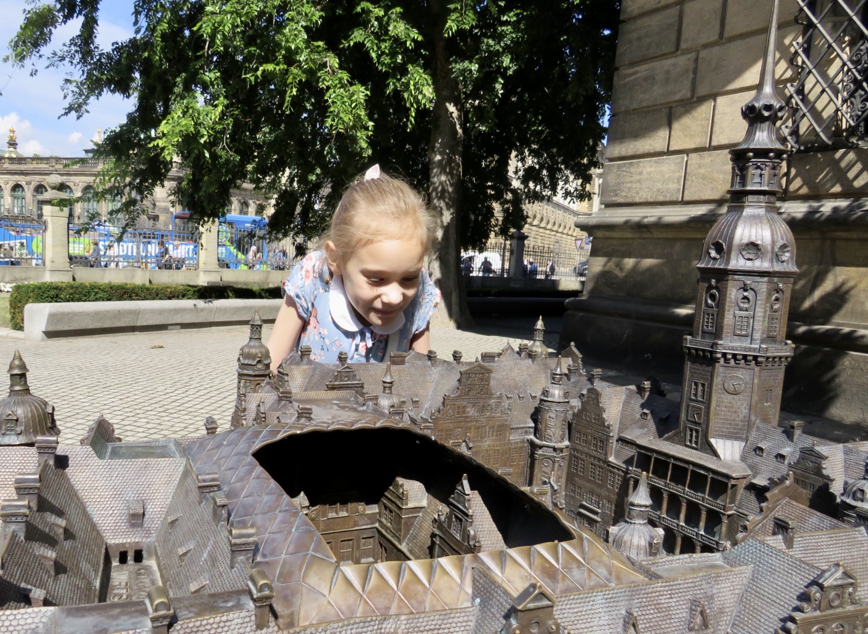 Первый сюрприз ждал нас уже в самом начале. Оказалось, что Маша была единственным ребёнком, кто пришёл! Никто больше в этот день не зарегистрировался. А значит у нас получилась, можно сказать, эксклюзивная экскурсия! Темой были «зеркала». Сначала Маше прочитали сказку о Белоснежке и семи гномах (там, где «Зеркальце, зеркальце на стене…), потом мы все вместе пошли «искать» зеркала в многочисленных залах дворца. Сначала поднялись по английской лестнице, как в своё время знатные гости поднимались, чтобы встретиться с королём. Потом прошлись по недавно открытым парадным залам (Die Königlichen Paraderäume Augusts des Starken), где восторженно осматривали дорогое убранство комнат. Увидели трон, на котором сидел Август Сильный. И всё это было рассказано доступным для ребёнка языком, в игровой форме, живо, с большим интересом и, я бы сказала, дозированно. Оттого Маша много всего не только узнала, но и запомнила — о свадьбе Фридриха Августа с Марией Жозефой, о королевском гардеробе, о придворном этикете…