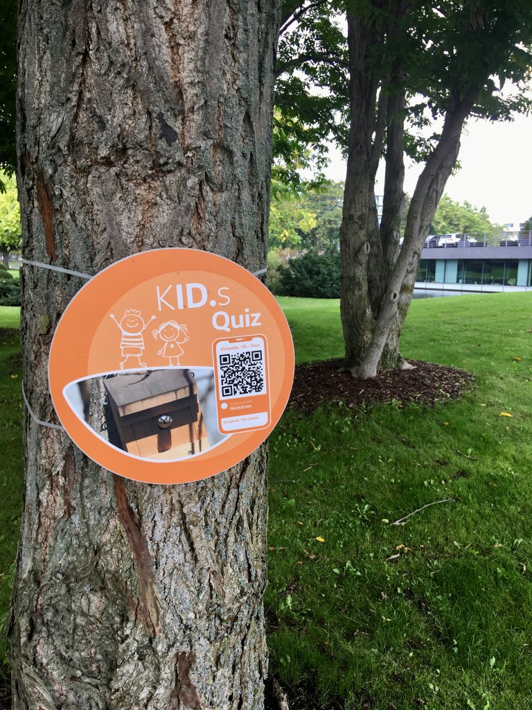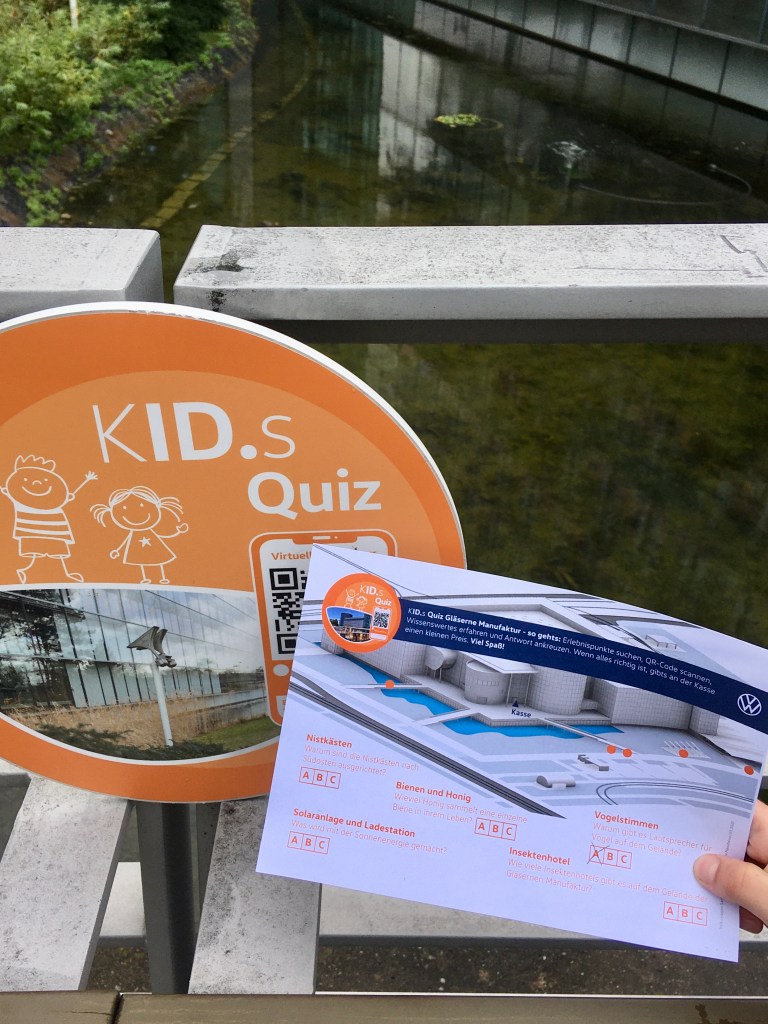 В конце экскурсии нам предстояло поучаствовать в викторине по теме «Защита окружающей среды». На территории вокруг завода, (которая сама по себе очень красива) находились специальные «станции» с вопросами. Найти их можно было при помощи карты, а вот «открыть» вопрос — при помощи QR -кода. В итоге мы узнали, к примеру, для чего вокруг здания стеклянной мануфактуры» стоят колонки, издающие пение и чириканье птиц, а также сколько мёда за всю свою жизнь производит одна пчела. Те, кто правильно ответят на все вопросы — получат сувениры от Gläserne Manufaktur.