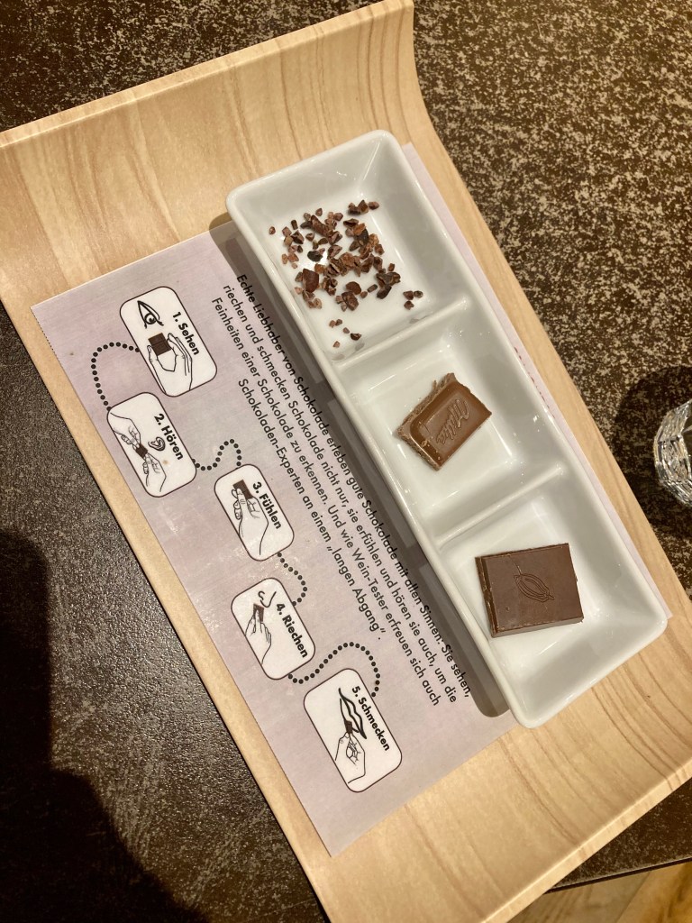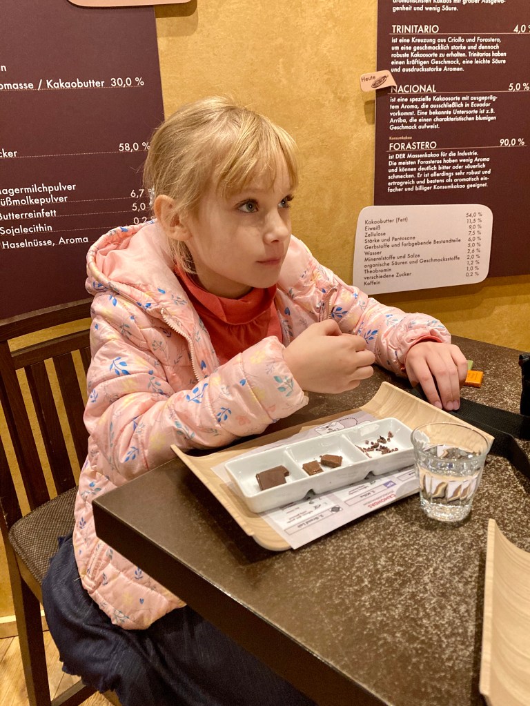 Есть ли на самом деле разница между качественным шоколадом и продуктом масс-маркета? В музее вы можете это проверить, даже больше — почувствовать себя дегустатором шоколада. Для примера вам дадут кусочек всем известной шоколадки «Милка» и кусочек элитного французского шоколада. Теперь нужно будет сравнить их по разным показателям: как он выглядит, как он пахнет, даже как он хрустит, не говоря уже о том, какой он на вкус. Дочка с ходу сказала: «О, Милка, самая вкусная!». Поэтому мы с ней ещё раз обсудили, почему у «Милки» такой вкус, сколько там сахара и прочих добавок, а сколько там непосредственно шоколада. Такой наглядный эксперимент в очередной раз заставляет задуматься, что мы покупаем и что мы едим.