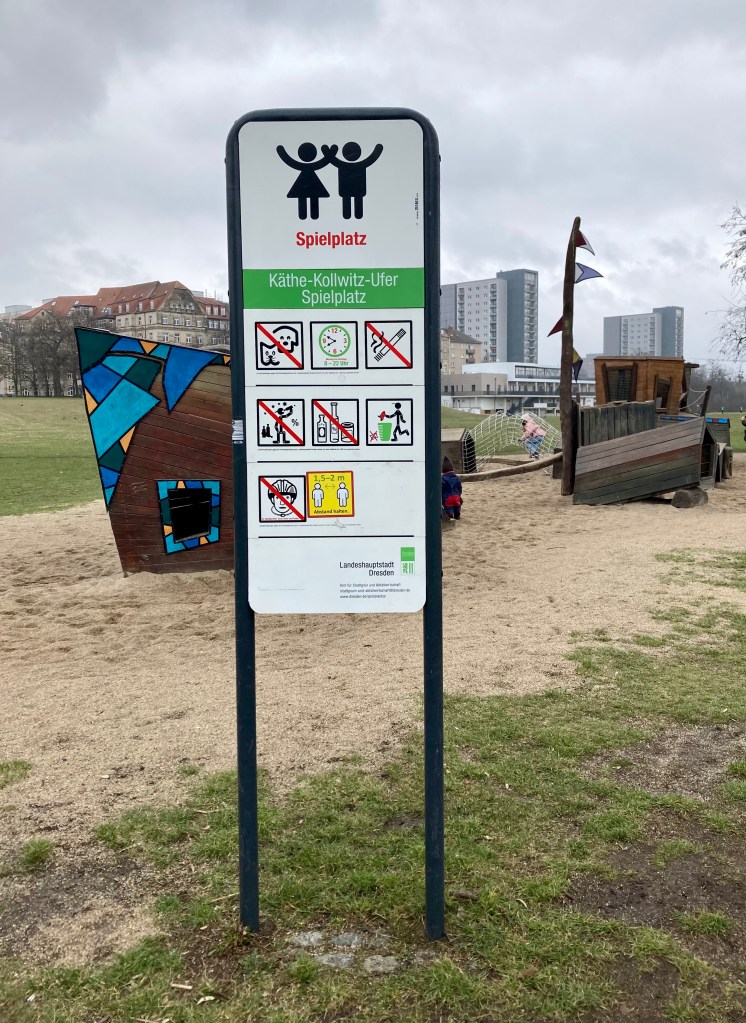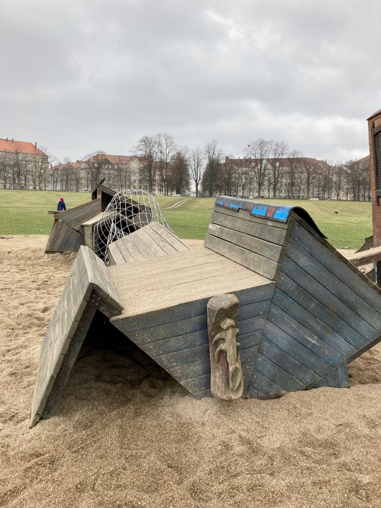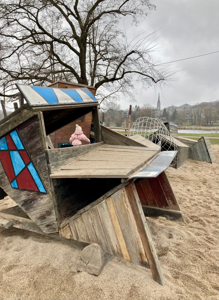 Детская площадка на Käthe-Kollwitz-Ufer была открыта в 2014 году после того, как она сильно пострадала после сильного наводнения. Поэтому неспроста детская площадка похожа на затонувший корабль. Сейчас там есть и лазалки и лабиринт и другие возможности для игр. Площадка подходит и детям постарше. Мы были там на выходных — в холод и дождь — и всё равно на площадке было много детей.