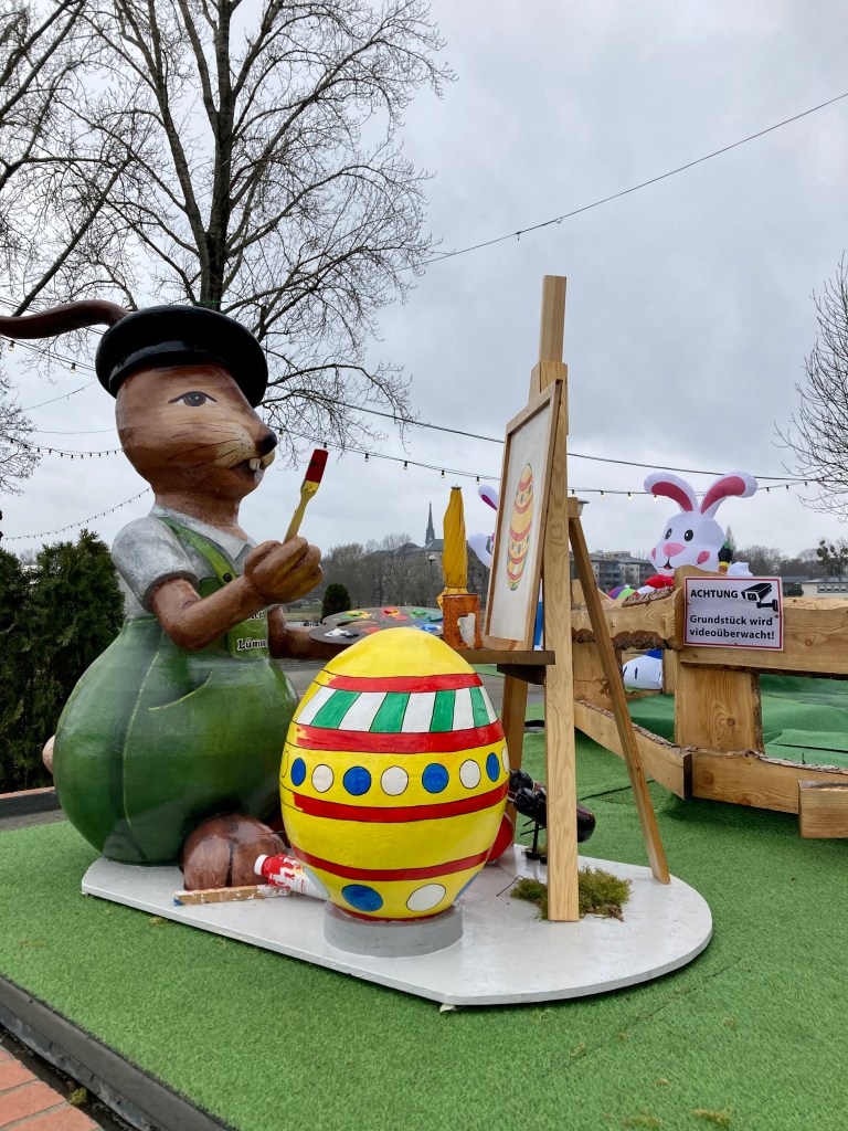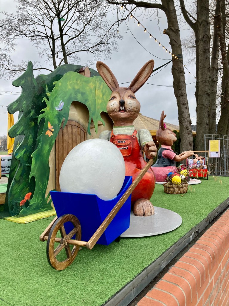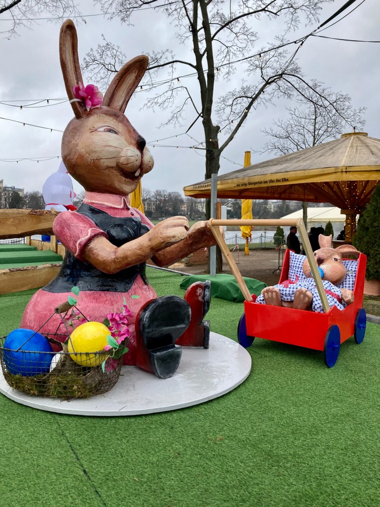 А ещё в нескольких шагах от площадки находится популярное место — уютный биргартен Fährgarten Johnannstadt. Во времена локдауна здесь предлагают еду и напитки „с собой“ (рекомендую сладкие творожные шарики — Quarkbällchen). А фигурки с пасхальными зайчиками на входе подарят праздничное настроение, с которым в этом году, на мой взгляд, как-то не складывается.