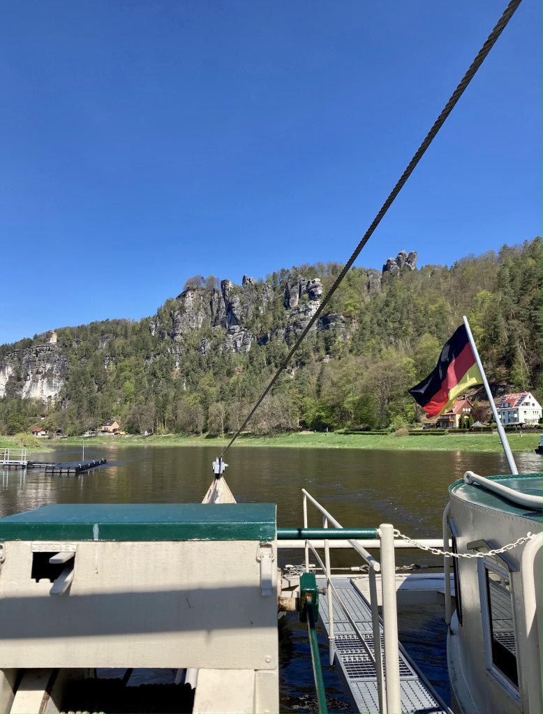 Итак, добраться до #kurortrathen очень удобно можно на городской электричке из Дрездена (ходит каждые полчаса). Затем переплываем на историческом пароме на другой берег (стоимость — 2,5 Евро туда и обратно). И попадаем в центр городка.