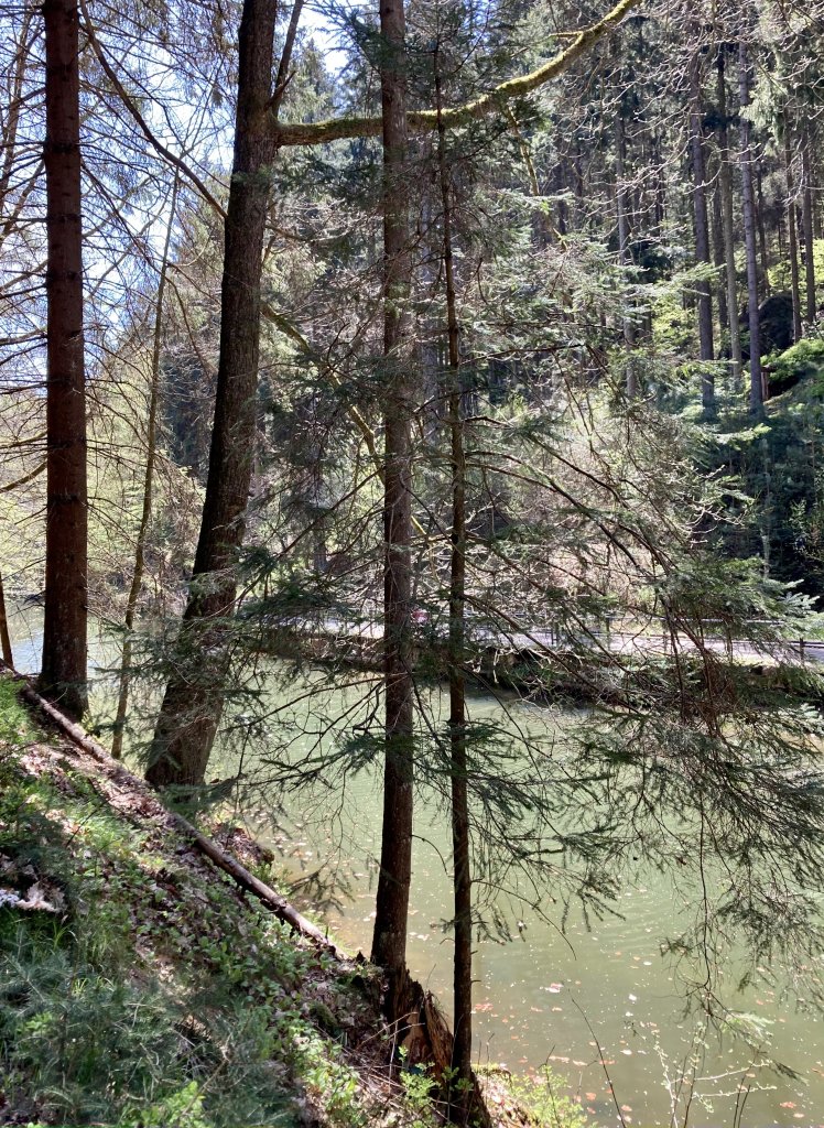 Но мы пошли по-другому, более лёгкому и короткому маршруту. От главной улицы мы повернули налево и вышли к озеру Amselsee. Захватывающее зрелище — изумрудного цвета вода, огромные скалы по обе стороны озёра, невероятная тишина… В обычное время по озеру можно было кататься на лодочках, сейчас — нет. Кроме того, здесь выращивают форель, и здесь же ее и коптят. Вкусную рыбку можно купить в местном ресторанчике.