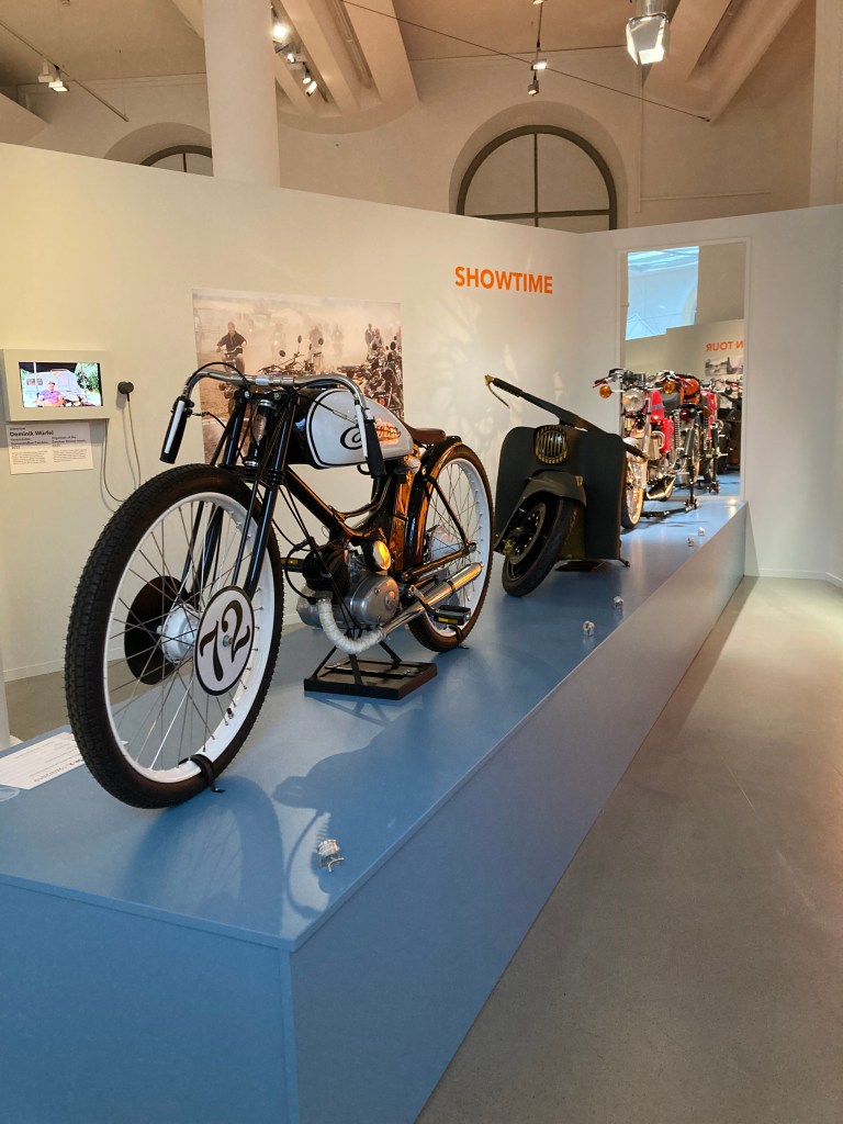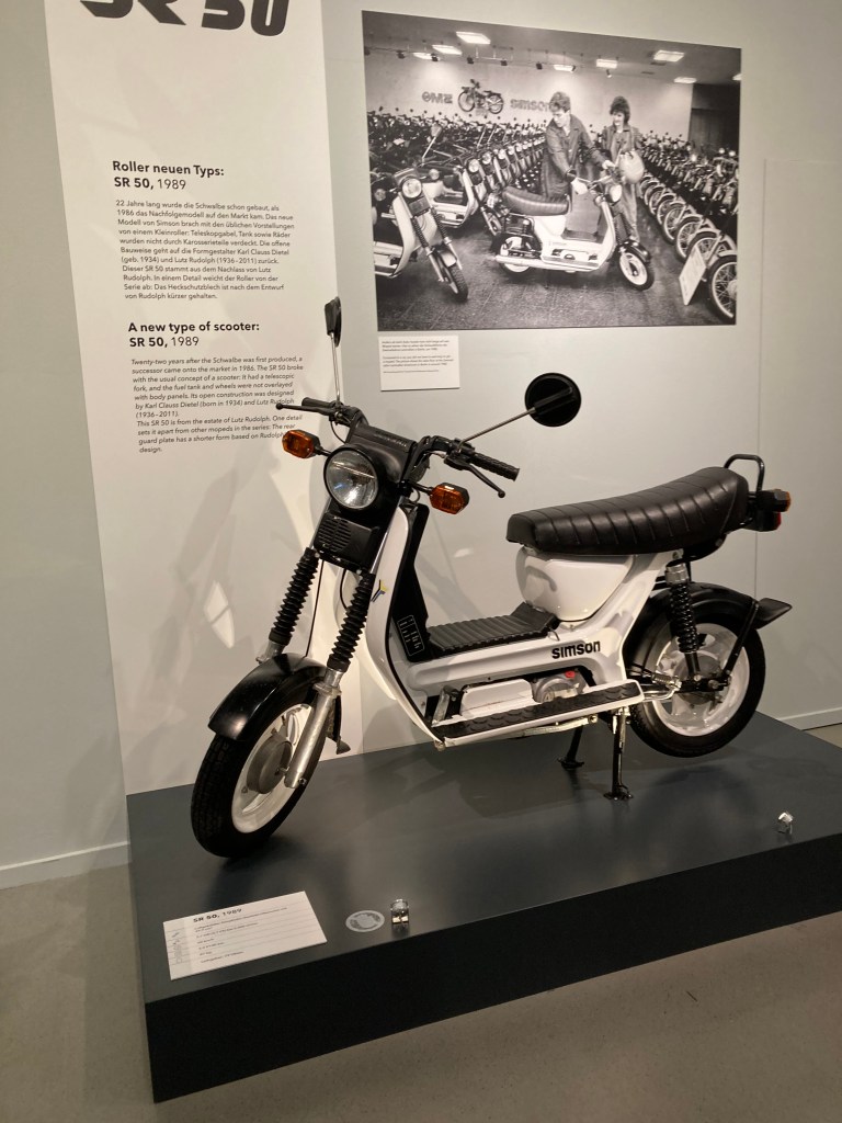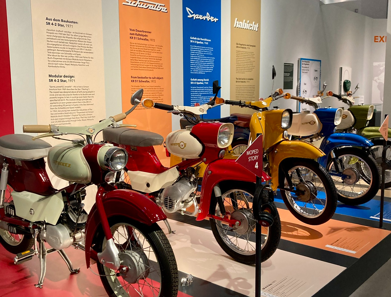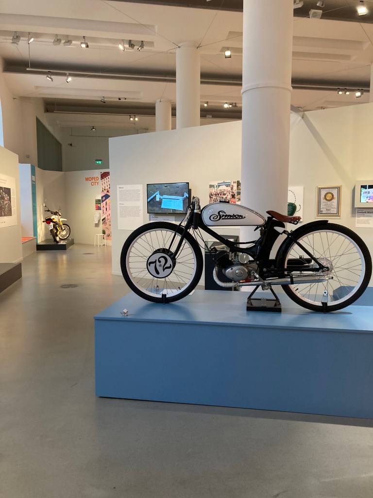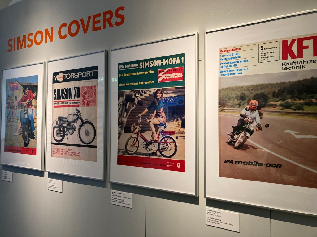 Выставка в Музее Транспорта рассказывает в том числе и об этом «камбэке». Но также очень подробно о технических характеристиках разных моделей, истории их производства. Было собрано большое количество автобиографического материала — люди рассказывают о своей любви к этим мопедам, вспоминают истории из молодости. На выставке можно посмотреть отрывки из ГДР-ских фильмов, где главные герои разъезжали на “Simson”- мопедах.