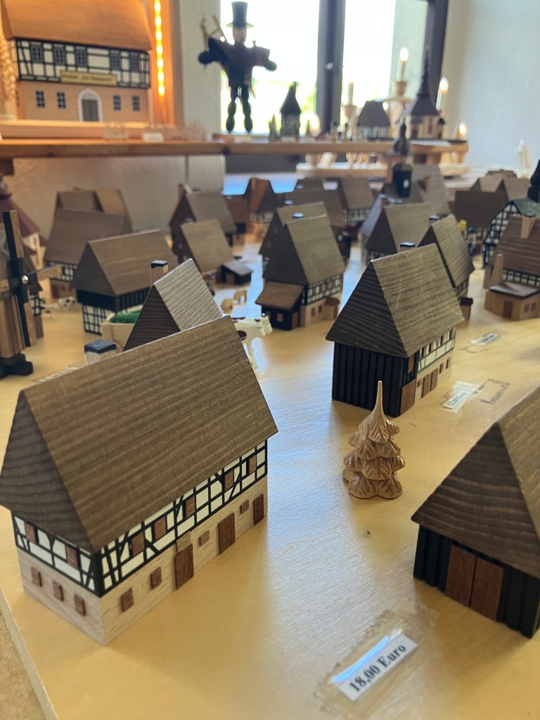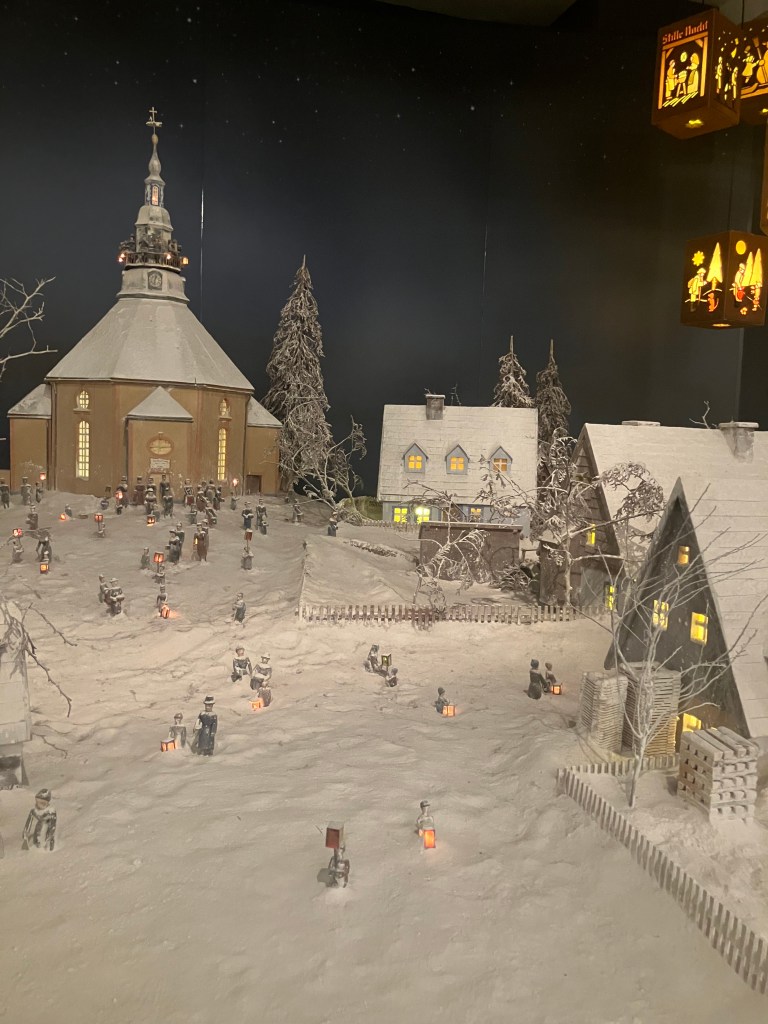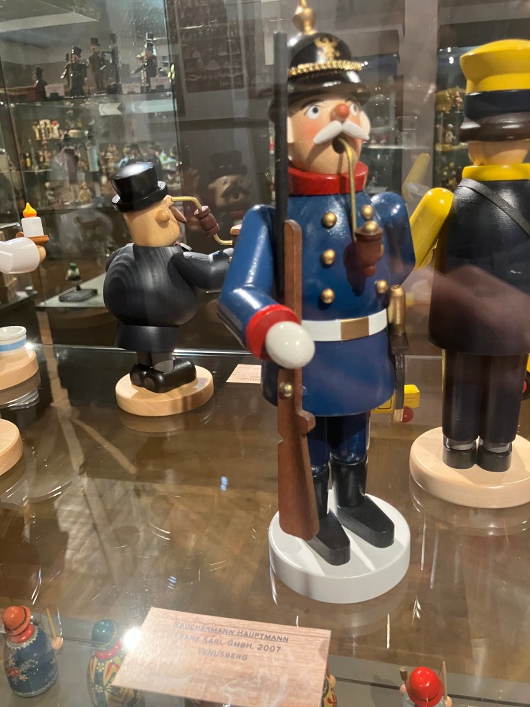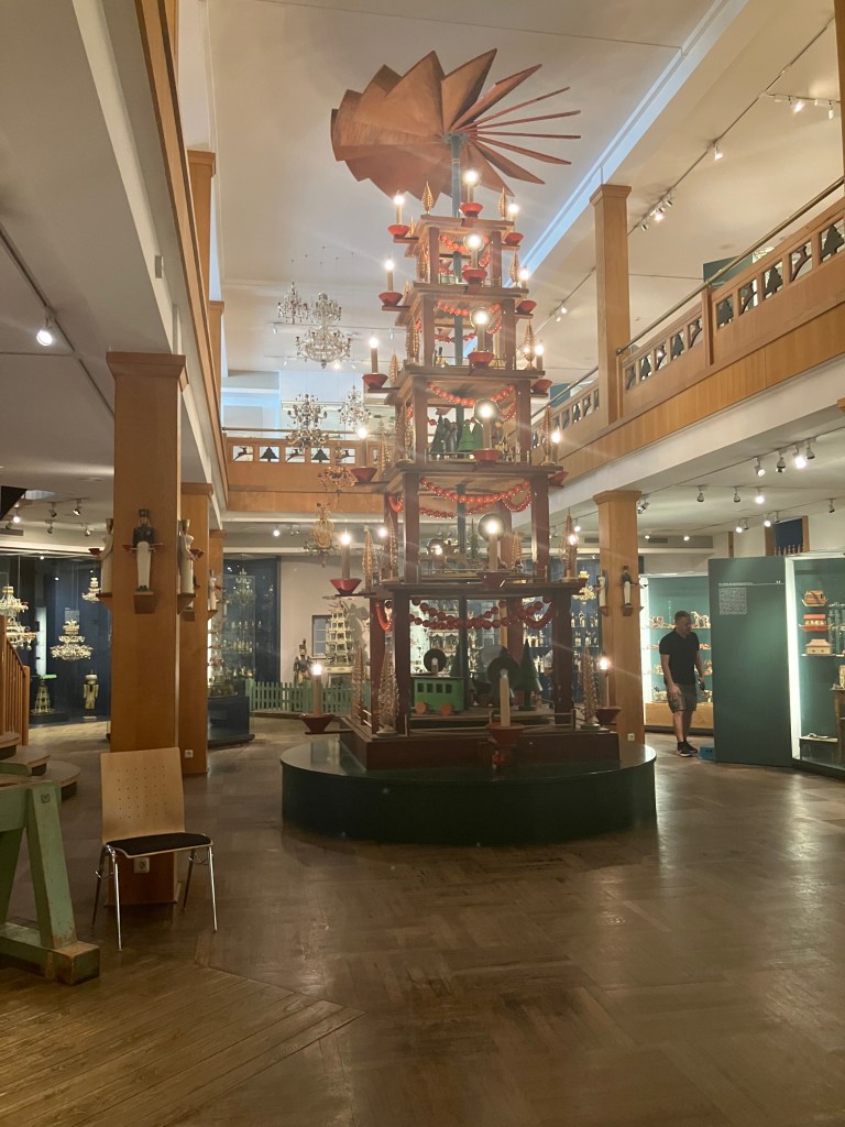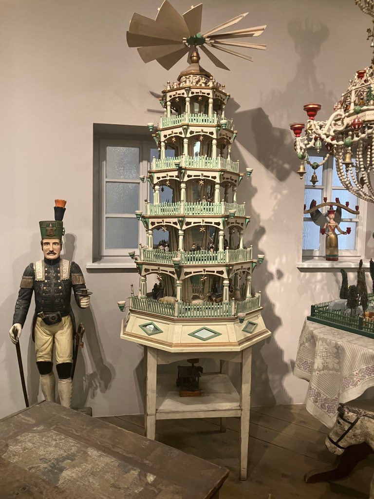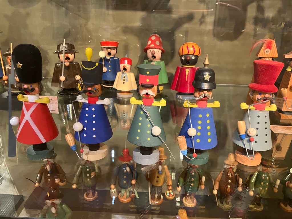 Но начнем наше знакомство с Музея игрушек — Erzgebirgisches Spielzeugmuseum. На трёх этажах музея представлены тысячи экспонатов игрушек (в том числе, конечно же, и рождественских) Рудных гор с 17 века и до наших дней. Глаза разбегались: рождественские пирамиды, щелкунчики, „курительные человечки“, кукольные миниатюры.